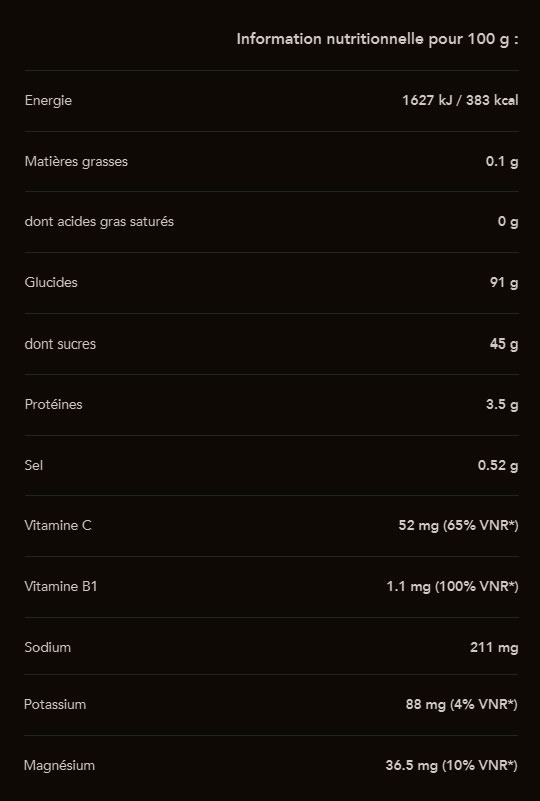 Par ailleurs, les électrolytes permettent de limiter ou de rétablir les pertes en minéraux dûes à la transpiration et à l'effort tout en apportant une énergie remarquable.