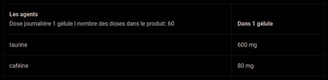 Chaque capsule contient 80mg de caféine et 600 mg de taurine.