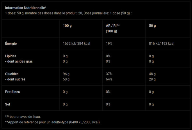 CARBOX est une boisson énergétique avant, pendant ou après effort constituée de 5 types de glucides (maltodextrine, dextrose, saccharose, du fructose et de l'amidon de maïs), garantie sans gluten, sans OGM, sans lactose. Ces différents glucides ont des indices glycémiques différents, c'est-à-dire qu'ils affectent les niveaux de sucre dans le sang à des degrés différents. En raison de leur vitesse d'absorption différente, certains d'entre eux fournissent à votre corps avec des glucides plus vite, tandis que les autres pour des périodes plus longues..