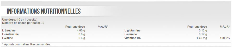 L-leucine, dextrose, acidifiant: acide citrique, arôme citron, L-isoleucine, L-valine, L-glut@mine, L-alanine, édulcorants: acésulfame K, sucralose; colorant: riboflavine, chlorhydrate de pyridoxine (vitamine B6).