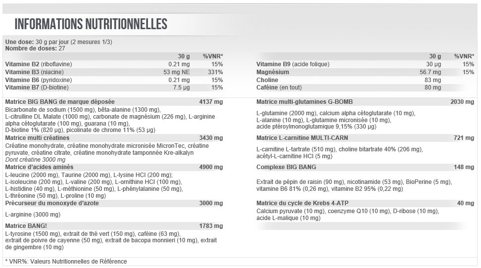 BIG BANG 3.0 est un produit pré-entraînement puissant et très complexe qui apporte 50 principes actifs avec une quantité modérée de glucides.
