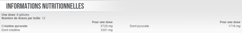 En effet, associée à du pyruvate, la créatine est beaucoup plus efficace et notamment pour résiter à l'effort et repousser ses limites en retardant au maximum la fatigue dans les activités d'endurance pure. Le pyruvate est aussi fondamental dans la régulation de la production de l’énergie et il stimule également la combustion des graisses, améliorant le rapport masse sèche / masse graisseuse.
