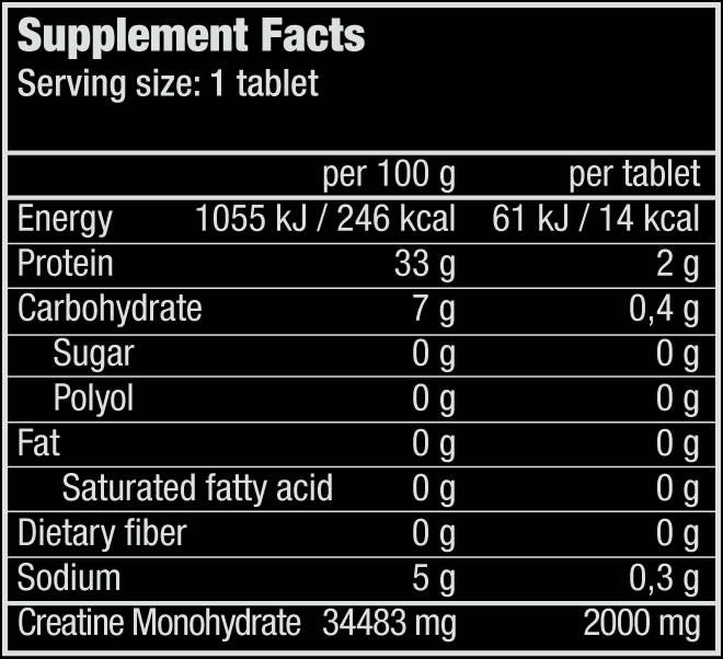 Dissoudre 1 comprimé effervescent dans 200 ml d'eau froide. 1 portion = 1 comprimé effervescent de créatine.
