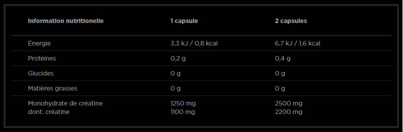 Créatine monohydrate micronisée, agent de charge - cellulose microcristalline, anti-agglomérant - stéarate de magnésium, comprimé - gélatine.