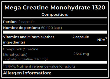 Mega Creatine de Scitec est constituée de gélules fortement dosées : chaque gélule contient 1320mg de créatine monohydrate pure, idéale pour tous ceux qui souhaitent favoriser une supplémentation importante.