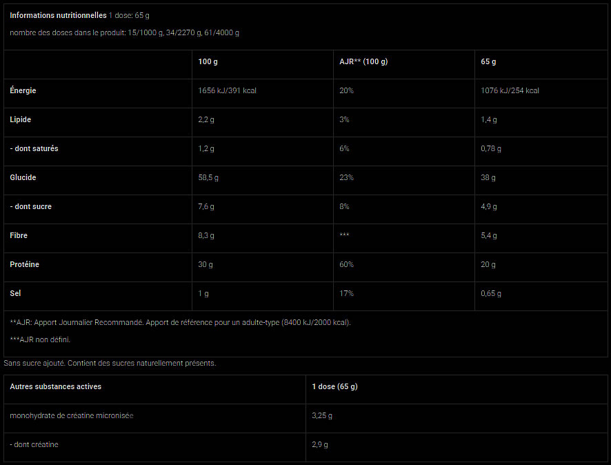 Maltodextrine, Dextrose, Fructose, Amidon de Maïs cireux, Palatinose* (Isomaltulose), Inuline, Protéines du Sérum de Lait ultrafiltré et concentré, Protéines du Sérum de Lait froid filtré et isolé, Protéines du Lait concentré, Peptides du Sérum de Lait hydrolysées, Caséinate de Calcium, Créatine Monohydrate micronisée, CreaBASE Créatine tamponné, Créatine Pyruvate, Créatine Citrate, LipoFusion (MCT - Triglycérides à Chaîne Moyenne - de Huile de Coco et de Palme, CLA - Acide Linoléique Conjugué - de huile de Tournesol, Huile de Lin), Epaississant: Carboxymethilcellulose, Edulcorant: Sucralose.