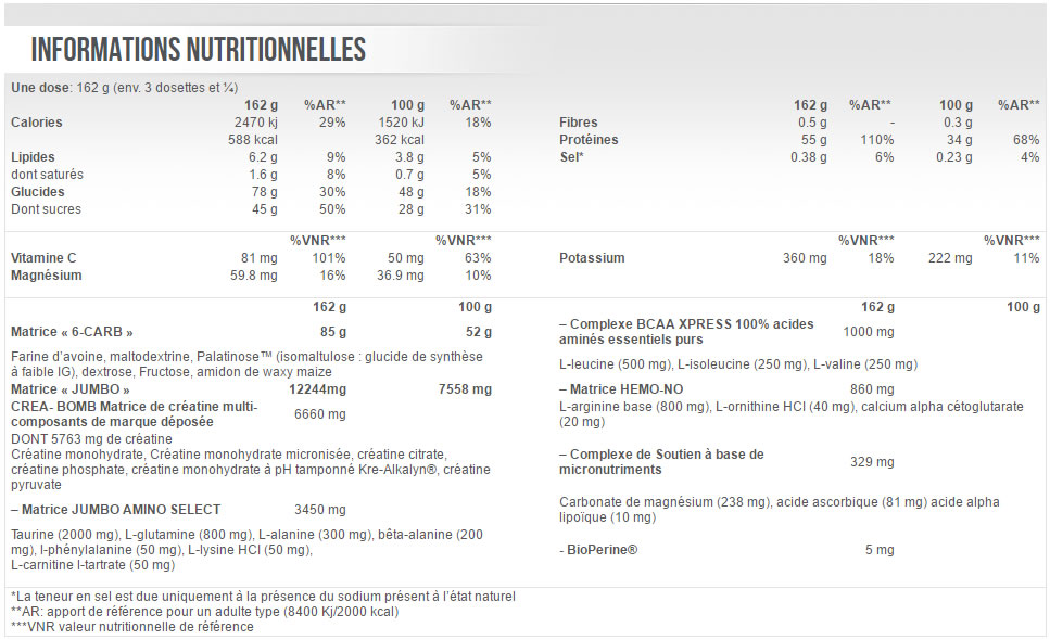 On appréciera également la présence d'une matrice anabolisante « Jumbo size » qui vous permettra de maintenir une progression en prise de masse grâce à un apport conséquent de nutriment accélérant vos résultats :
