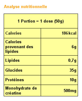 Dextrose, concentré de protéines de lactosérum obtenu par ultrafiltartion, contenant des microparticules de lactalbumine, lactoglobuline, lactoferine et immoglobuline. Hydrolysate de protéine de blé, maltodextrine, arômes naturels et artificiels, cacao hollandais, monohydrate de créatine créapure, complexe de vitamines et minéraux (acide ascorbique, acetate de dl-alphatocopherol, hydrochloride de thiamine, riboflavine, acide nicotinamide, nitrate de pyridoxine, acide folique, cyanacobalamine, biotine pantothénate de calcium), gomme de xanthan, aspartame*.* Phénylkétonurique : contient de la phénylalanine.