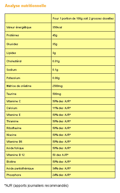 * 2500mg de combinaison de plusieurs créatines (créatine monohydrate, créatines éthyl ester et malate, créatine micronisée)