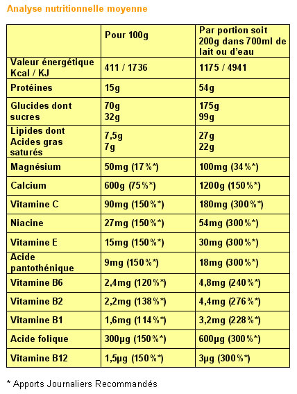 Maltodextrine, fructose, lait écrémé en poudre, protéines de lait, triglycérides à chaîne moyenne (huile TCM), poudre de cacao fortement dégraissé, protéines de petit lait, citrate de calcium, épaississant : gomme de guar, arôme (avec lactose), émulsifiant : ester d'acide citrique de mono et di-glycérides d'acides gras, lécithine de soja, chlorure de sodium, L-Carnitine 0.1%, vitamine C, carbonate de magnésium, niacine, vitamine E, pantothénate, vitamine B6, vitamine B2, vitamine B1, acide folique, vitamine B12. 100 ml de produit prêt à l'emploi (200 g de poudre dans 700 ml de lait écrémé) apportent 608 kJ (145 kcal).