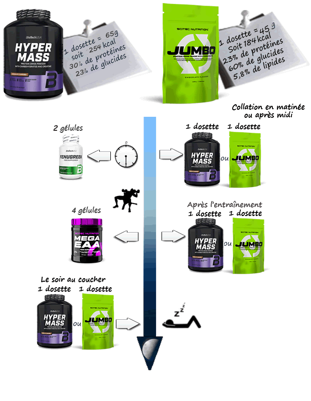 Sur les 10 derniers jours, vous basculez sur l'HYPER MASS (200 g par jour en 3 fois) qui est plus concentré en protéines pour consolider votre prise de masse. La combinaison de ces 2 gainers est parfaitement adaptée aux sportifs débutants à la recherche de résultats concrets et rapides en prise de masse musculaire pour faire un premier point à la fin des 20 jours de consommation. Les Mega EAA vous aideront à la récupération et aussi à construire du muscle pour compenser le faible taux de protéines des gainers hyper caloriques.