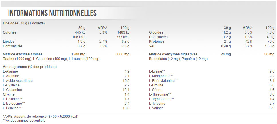 100% Milk Complex contient également d’autres composants : une matrice d’acides aminés qui apporte d’autres acides aminés, à savoir de la L-leucine, de la L-glut@mine et de la taurine. Nous avons également ajouté dans notre formule deux enzymes digestives, de la bromélaïne et de la taurine.