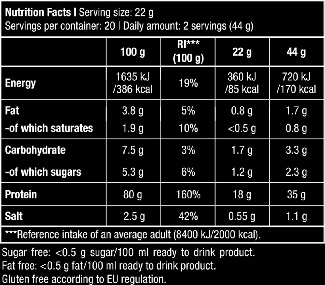 Le profil d'acides aminés pour 1 dose (22 g): Acides aminés essentiels (Histidine, Isoleucine•, Leucine•, Lysine, Méthionine, Phénylalanine, Thréonine, Tryptophane, Valine•): 7,8 g. Acides aminés conditionnellement essentiels (Cystéine, Glutamine et Acide glutamique, Proline, Tyrosine): 6,8 g. Acides aminés non essentiels (Alanine, Acide aspartique, Glycine, Sérine): 3,5 g. •Total BCAA: 3,7 g..