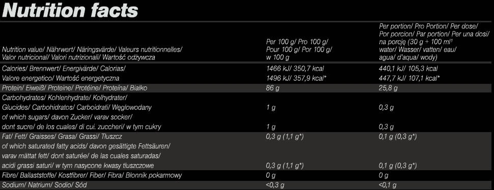 Les personnes en sèche bénéficieront également avec la Pure Whey Isolate 95 d’un supplément protéiné très pauvre en glucides et lipides. Sur une dose de 30g, vous avez 26 g de protéines, 0,3 g de sucre et 0,1 g de lipides.