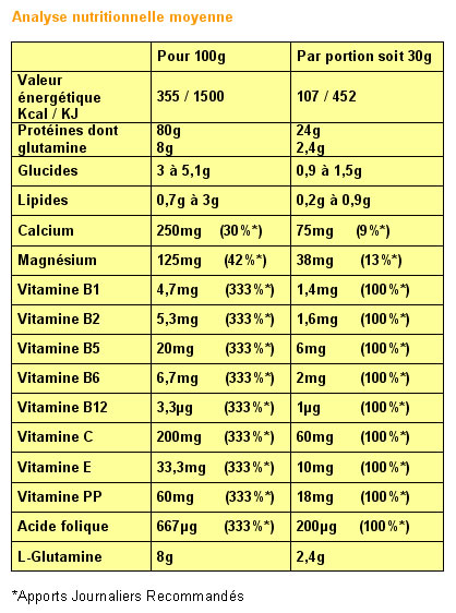100 ml de produit prêt à l'emploi (30g dans 300ml d'eau) apporte 144 kJ (34 kcal).