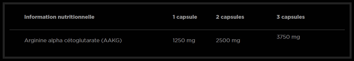 Arginine alpha-cétoglutarate (AAKG), agent de charge - cellulose microcristalline, agent anti-agglomérant - stéarate de magnésium; capsule - gélatine bovine.
