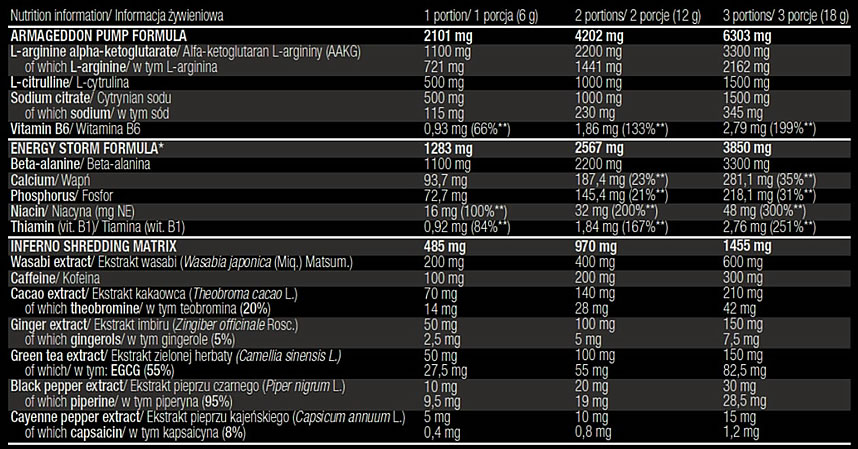 Bêta alanine, L-arginine alpha kétoglutarate, citruline malate, créatine monohydrate, sodium citrate, acide citrique, créatine malate, calcium phosphate, arômes, dioxyde de silicone, caféine, acide malique, acésulfame potassium, sucralose, nicotinamide, niacine, extraits de plantes (wasabi, cacao, gingembre, thé vert, poivre de Cayenne, poivre noir) pyridoxine Hcl, thiamine Hcl (vitamine B1), colorants: cumin.