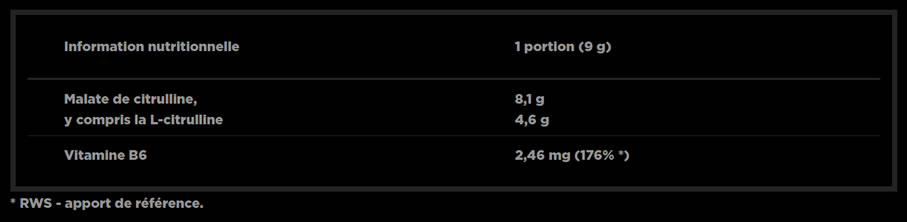 Citrulline malate, régulateur d'acidité - citrate de sodium; arôme, édulcorants - acésulfame K, sucralose; agent anti-agglomérant - dioxyde de silicium; chlorhydrate de pyridoxine - vitamine B6.