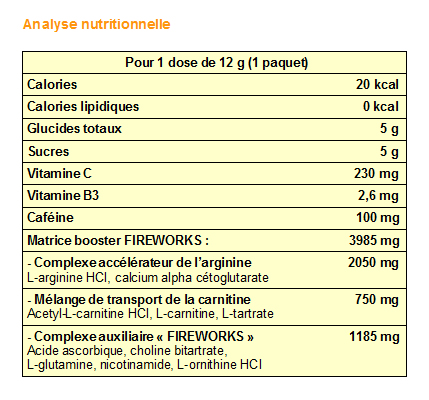 Enfin, Fireworks contient une quantité modérée de glucides qui servira de carburant immédiat et sera transformée en énergie durant la séance d'entraînement.