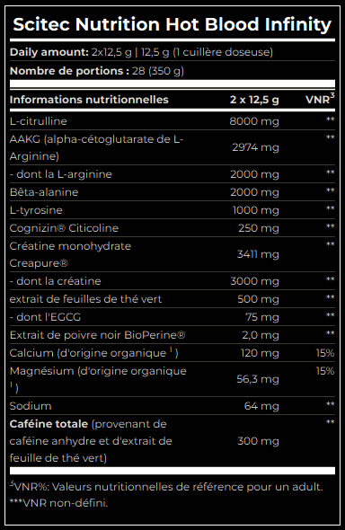 Hot Blood Infinite de Scitec Nutrition est une version plus moderne et plus équilibrée que la version Hardcore. Il contient les basiques d'un booster efficace comme la L-citrulline et l’arginine contenue dans l'AAKG qui offrent une congestion musculaire optimale. La bêta-alanine aide à soutenir les entraînements de longue durée. La créatine monohydrate Creapure fournit la dose quotidienne de 3 g, qui améliore les performances physiques lors d’efforts courts, répétés et intenses.
