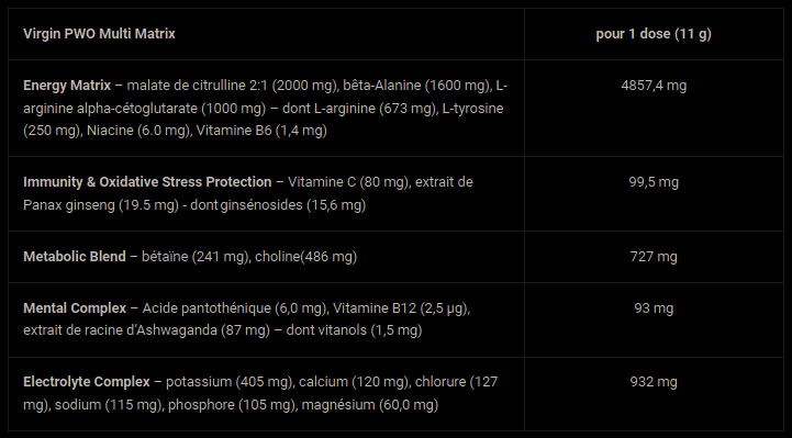 Bêta-alanine 15%, L-citrulline 12% choline bitartrate, agent de charge (polydextrose), L-arginine alpha-cétoglutarate 9,1%, acide malique, sels de potassium de l'acide orthophosphorique, arômes, sels calciques de l'acide citrique, magnésium bisglycinate, citrate de sodium, chlorure de potassium, L-tyrosine 2,3%, bétaïne, acidifiant (acide citrique), anti-agglomérant (dioxyde de silicium), extrait d'Ashwagandha [extraiz de racine d’Ashwagandha (Withania somnifera) 0,91%, maltodextrine], acide L-ascorbique , édulcorant (sucralose), sel, extrait de tige et de feuille de ginseng coréen (Panax ginseng) 0,18%, D-pantothénate de calcium, acide nicotinique, chlorhydrate de pyridoxine, colorants (tartrazine, Rouge Allura AC)1, cyanocobalamine. 1Tartrazine, Rouge Allura AC: peut avoir des effets indésirables sur l'activité et l'attention chez les enfants. Fabriqué dans une usine qui utilise du lait, des oeufs, du soja, des crustacés, du dioxyde de soufre et des arachides.
