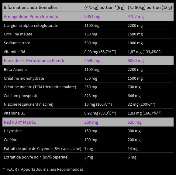 Enfin, la matrice Red Fury vous proposera de nombreux stimulants dont la caféine avec un dosage relativement conséquent.