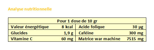 Constitué d'une matrice de créatine (monohydrate, micronisée et créatine citrate...), War Machine vous aidera à apporter à vos muscles suffisamment de créatine (3000 mg par dose) pour optimiser les performances de vos séquences d'entraînement musculaires.