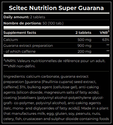Carbonate de calcium, préparation d'extrait de guarana [extrait de graines de guarana (Paullinia cupana), caféine] 31 %, agent de charge (gel de cellulose), antiagglomérants (dioxyde de silicium, sels de magnésium d'acides gras), enrobage [stabilisants (copolymère greffé alcool polyvinylique-polyéthylène glycol, alcool polyvinylique), antiagglomérants (talc, mono- et diglycérides d'acides gras)]. Fabriqué dans une usine qui transforme également des produits contenant du lait, des oeufs, du gluten, du soja, des arachides, des fruits à coque, du céleri, du poisson, des crustacés et du dioxyde de soufre.