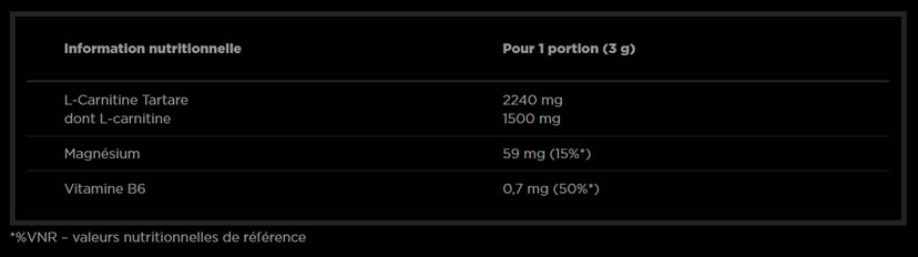 74,7% L-Carnitine-L-Tartare, arômes, maltodextrine, colorant - E 150d (pour le goût : cola); Oxyde de magnésium, antiagglomérant - dioxyde de silicium; Édulcorants - acésulfame K, sucralose ; Régulateur d'acidité - acide citrique ; Colorants : carotène (A), carmin (B), riboflavine (C), E 150c (D), E 150d (E), E 133 (F), bleu patenté V (G), carmins d'indigo (H), chlorophylles et chlorophyllines (I), curcumin (J), anthocyanes (K), extrait de paprika (L), betanine (M), charbon végétal (N); 0,03% chlorhydrate de pyridoxine - vit. B6.