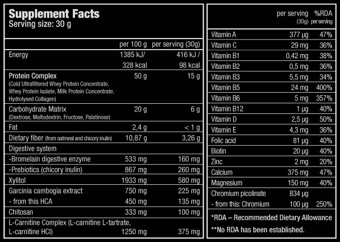 Avec une teneur en hydrates de carbone complexe, la teneur en protéines d'Ultra Loss favorise la croissance et le maintien de la masse musculaire et des os normaux. En plus des autres vitamines et du calcium, le produit contient également du magnésium, de la vitamine B12 et de la niacine. Le magnésium favorise la synthèse normale des protéines, la fonction musculaire normale et le fonctionnement normal du système nerveux. La niacine et la vitamine B12 réduisent la fatigue.